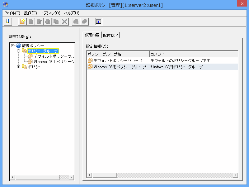 [監視ポリシー[管理]]画面で、[設定対象]の[ポリシーグループ]を選択し、[操作]メニューの[新規作成]を選択します。