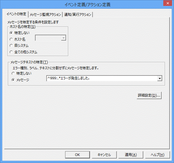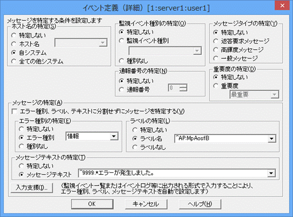 設定した監視の条件と実際に発生するメッセージを比較する場合、文字の全角/半角、空白の数等に誤りがあると正しく条件に一致しません。テキストおよび説明への設定は、カット&ペースト機能を使用してください。