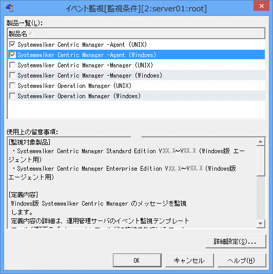 [製品一覧]-[製品名] | Systemwalkerテンプレートの登録されている製品名が一覧で表示されます。 表示された中から、監視対象とする製品を選択します。 | [イベント監視[監視条件]] |
