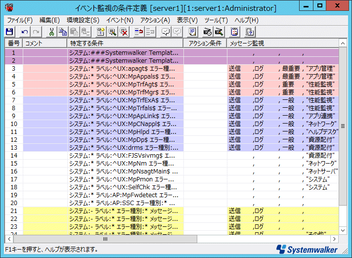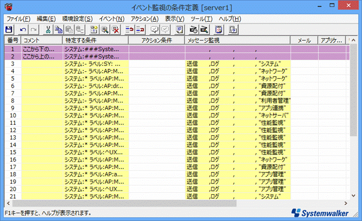 [イベント監視の条件定義]ウィンドウには、定義した内容が「メッセージを特定する条件」単位に一覧表示されます。定義した内容は、一覧の上から下に順番に処理されます。したがって、以下の点を考慮して、定義の順番を検討する必要があります。