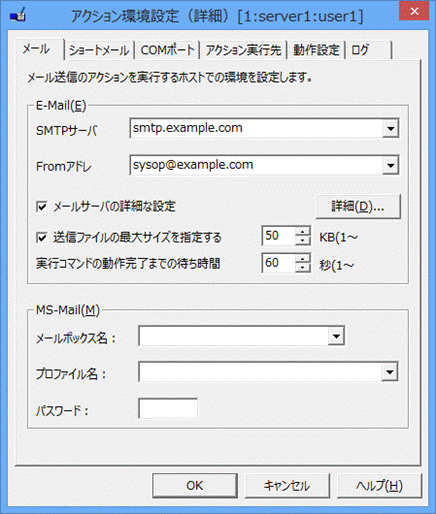 [E-Mail] | [イベント定義/アクション定義]で定義したメール送信に対して、実行するための環境を設定します。 | [アクション環境設定(詳細)]の[メール]タブ |