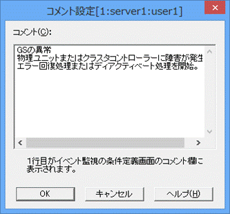 定義の目的や修正履歴などのコメントを設定し、[OK]ボタンをクリックします。[イベント監視の条件定義]画面の[コメント]列には、ここで設定したコメントの1行目だけ(以下の例の場合「GSの異常」だけ)が表示されます。2行目以降に設定した内容の表示については、“コメントの表示”を参照してください。