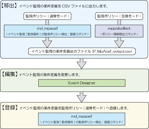 また、監視ポリシー(互換モード)でmppolcollect(ポリシー情報移出コマンド)を使用して移出したイベント監視の条件定義出力ファイル(P_MpAosf_evtact.csv)を、監視ポリシー(通常モード)へ登録することができます。