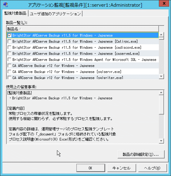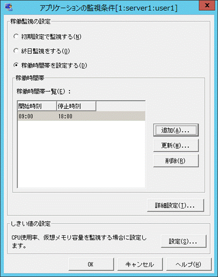 監視するアプリケーションを選択し、監視する条件(監視する時間帯/しきい値監視)を設定します。また、監視対象製品以外のアプリケーションを追加、更新、削除できます。