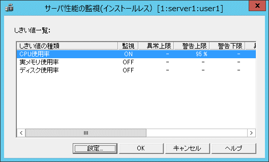[サーバ性能の監視(インストールレス)]画面で、[しきい値一覧]の監視する項目を選択し、[設定]ボタンをクリックします。