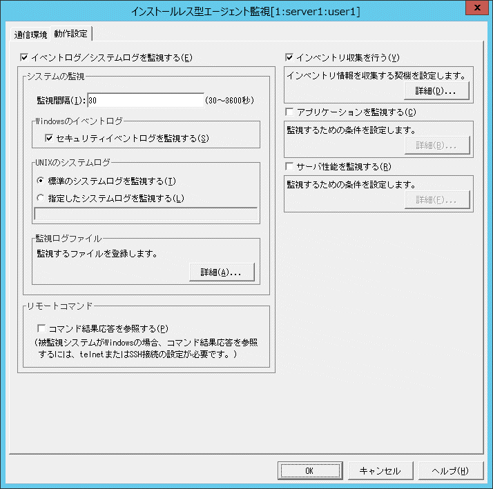 [イベントログ/システムログを監視する] | イベントログ/システムログの監視を行う場合、監視間隔などを設定します。 | [インストールレス型エージェント監視]の[動作設定]タブ |