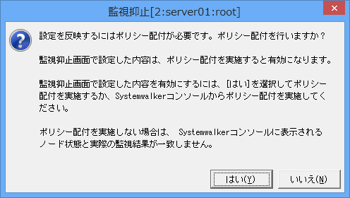 なお、コマンドによる監視抑止の設定/解除にて、「-z」オプションを指定した場合、ポリシー配付の確認画面で[いいえ]を選択した場合などで、ポリシーを配付しないと、以下の影響があります。Systemwalkerコンソールから別途ポリシー配付を実施してください。