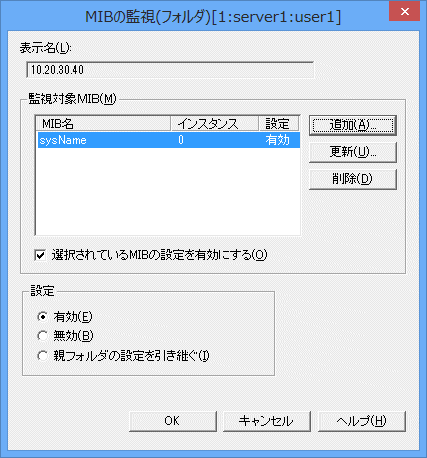 特定のMIBを一時的に監視対象から外すときには、監視対象MIBの一覧からMIBを選択し、[選択されているMIBの設定を有効にする]オプションボタンのチェックを外します。