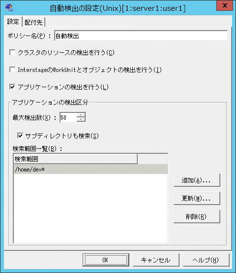 UNIXサーバの場合、自動検出されたアプリケーションの実行パスは、すべて自動検出時に指定したパス(フルパス)指定の登録となります。検出対象のアプリケーションが、カレントパスまたは相対パスで動作し、そのアプリケーションを監視する場合は、“手動でアプリケーションを登録する”に従い、アプリケーションを再登録してください。