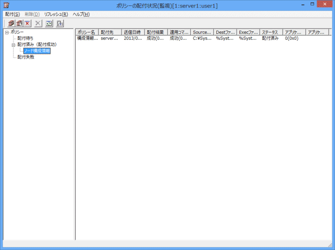 [ポリシーの配付状況]画面の左側ツリーにて[配付済み(配付成功)]を展開し配付したコンポーネントを選択します。画面右側のリストに配付したポリシーの情報が表示されると配付成功です。
