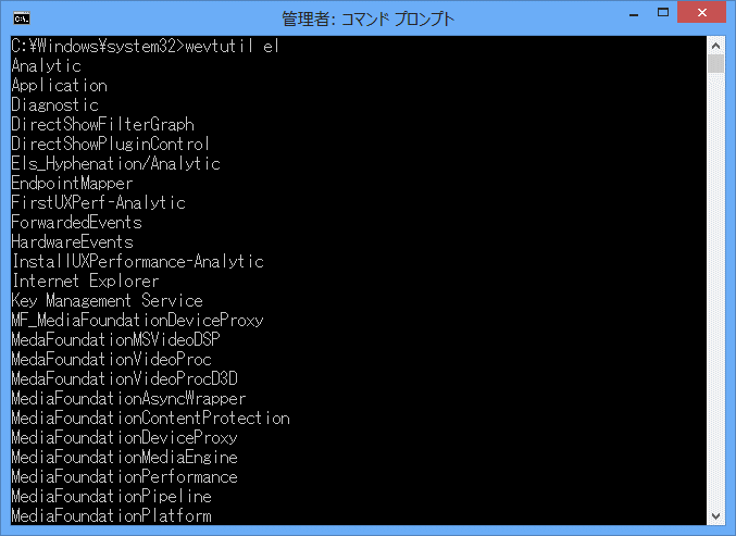 以下のコマンドを実行した結果、typeが「Admin」、または「Operational」と表示されるものが、監視可能なカスタム イベントログです。