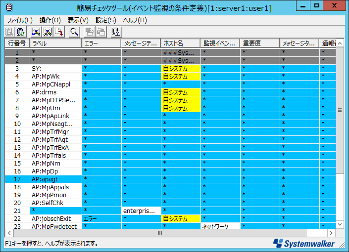 アクション実行条件およびアクションは、[簡易チェックツール(イベント監視の条件定義)]画面の初回起動時には表示されません。表示するには、[表示]メニューより[列の選択]を選択し、[列の選択]ダイアログから必要な情報を選択します。表示している列の情報は、次回の簡易チェックツール起動時に引き継がれます。