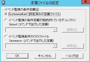 簡易チェックツールを使用して確認するイベント監視の条件定義を設定します。簡易チェックツールの起動時、および、[簡易チェックツール(イベント監視の条件定義)]画面より[ファイル]メニューの[定義ファイルの設定]を選択した場合に、[定義ファイルの設定]ダイアログボックスが表示されます。