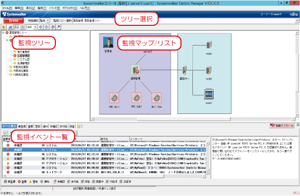 Systemwalker Centric Managerは、システムの各ノードを監視します。監視状況は、Systemwalkerコンソールで把握することができます。
