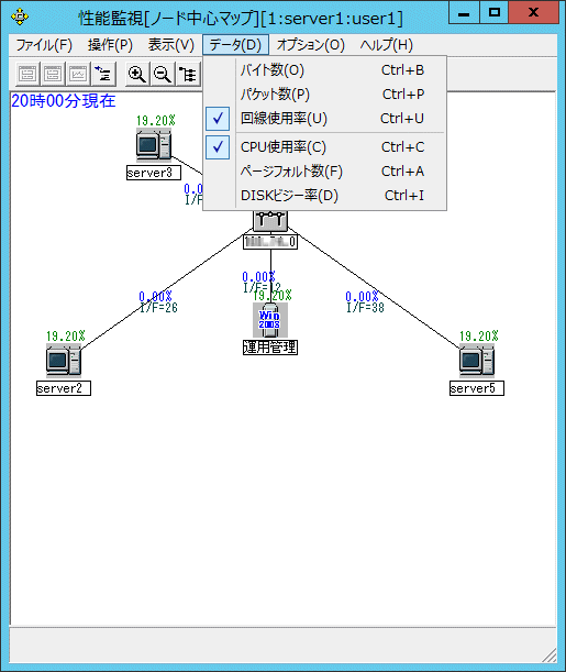 性能監視マップ上に表示するデータ(トラフィック情報、サーバ性能情報)は、[データ]メニューからそれぞれ1つの項目を選択して表示します。