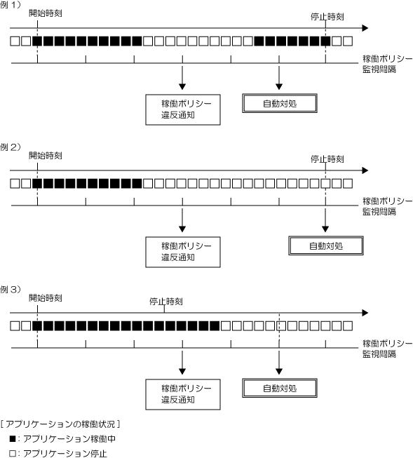 稼働ポリシー(停止)違反が発生した後、次の監視開始時刻までの間に、アプリケーションが停止した場合(例3)