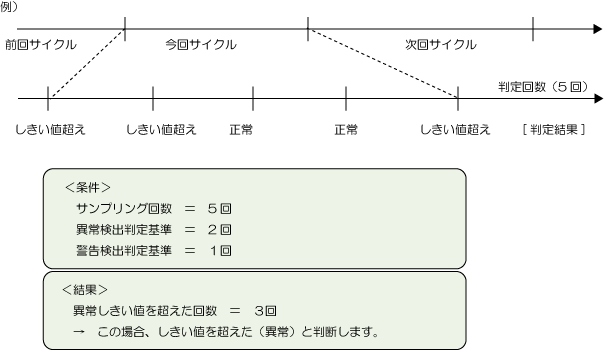 しきい値ポリシーで指定されたサンプリング回数分、サンプリング間隔ごとにデータを採取し、採取したデータがしきい値を超えているかどうかを判定します。異常検出判定基準または警告検出判定基準に指定した回数以上、しきい値超えを検出した場合、「しきい値を超えた」と判断されます。