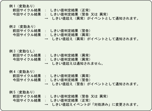 しきい値超えのイベントが通知されるのは、しきい値判定結果が前回のしきい値判定結果から変動したときだけです(下図の例1、例2、例4)。下図の例3のように、前回サイクルで「異常しきい値超え」と判定し、今回サイクルでも「異常しきい値超え」と判定した場合、しきい値異常のイベントは通知されません。