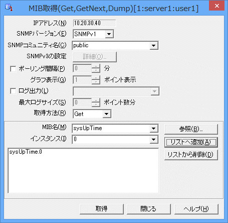 [MIB名]に取得したいMIB名、[インスタンス]に取得するMIBのインスタンスを指定します。