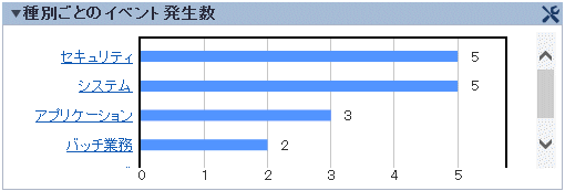 縦軸が種別、横軸をイベント数として、上からイベント数が多い種別が表示されます。製品インストール後に追加した監視イベント種別も表示されます。