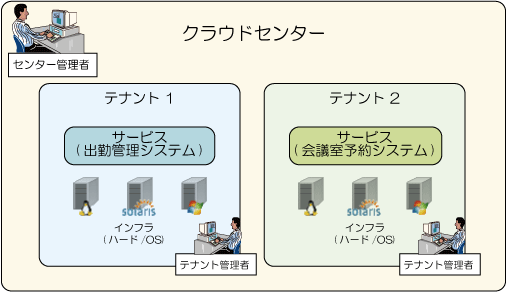 そこで、テナントごとに管理者(Systemwalker Centric Manager の操作権ユーザー)を設定し、テナント個別の運用/監視を任せることで、テナントごとに個別の運用/監視がスムーズに行えるようになります。