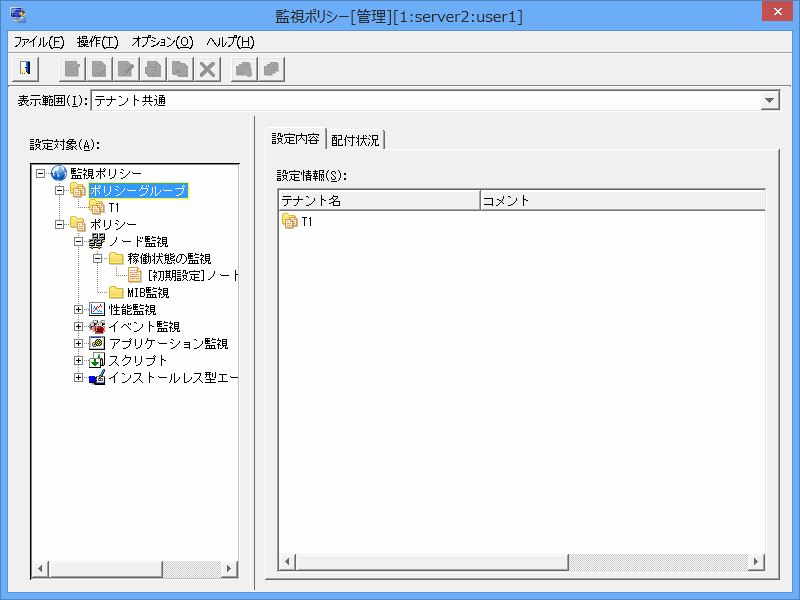 [監視ポリシー[管理]]画面を起動します。 [表示範囲]コンボボックスを[テナント共通]に切り替えます。
