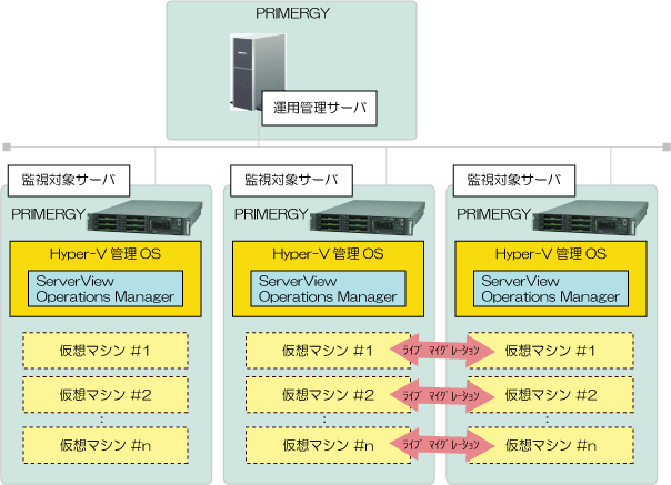 Hyper-Vによる仮想化を行ったシステムの監視を行う場合のシステム構成例を以下に示します。