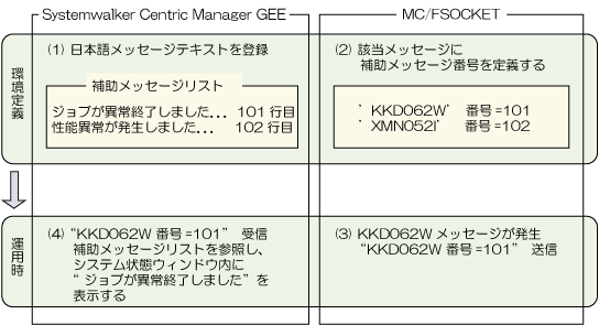 Systemwalker Centric Manager GEEでは、受信したメッセージの補助メッセージ番号を、ここで定義した補助メッセージリストと照らし合わせることにより、対応する日本語の補助メッセージで通知します。