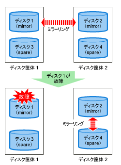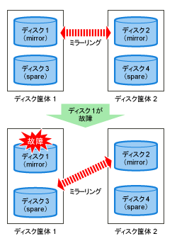 スペアディスクの検索を、I/O エラーが発生したディスクとは別のディスク筐体および別のコントローラから開始することにより、速やかに正常なスペアディスクを見つけてミラーリング状態を回復することができます。
