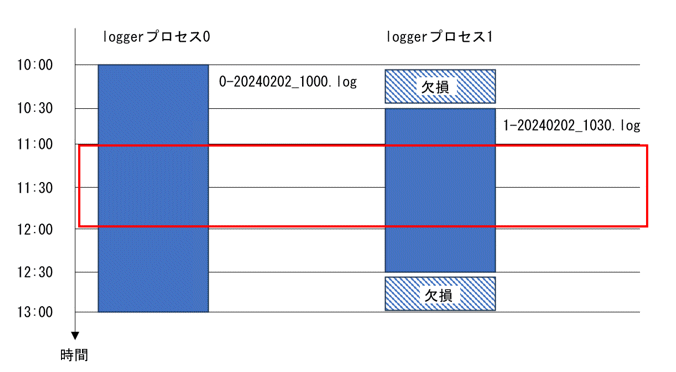 例えば、下図のように、11:00~12:00の監査ログを分析の対象としているときに、loggerプロセス0が10:00~13:00に出力したファイルと、loggerプロセス1が10:30~12:30に出力したファイルをロードしたとします。ロードしたテーブルには、10:00~13:00までの監査ログレコードが含まれているように見えますが、一部の監査ログ(loggerプロセス1が10:00~10:30と12:30~13:00に出力した監査ログ)はロードされていません。