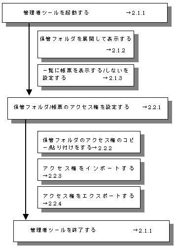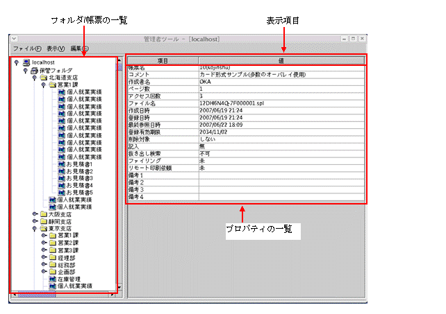 管理者ツールの左側には、保管フォルダが表示されます。保管フォルダを展開して表示することによって、フォルダと帳票の一覧が表示されます。任意のフォルダ、または帳票を選択すると、右側にプロパティの一覧が表示されます。なお、フォルダを選択するか、帳票を選択するかによって、プロパティの一覧に表示される項目が変わります。