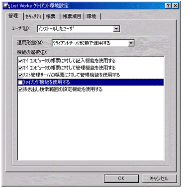 「マイコンピュータの帳票に対して管理機能を使用する」、「リスト管理サーバの帳票に対して管理機能を使用する」をチェックします。ただし、リスト管理サーバに管理者権限のあるユーザでログインした場合には、「リスト管理サーバの帳票に対して管理機能を使用する」をチェックしなくてもファイリングを行うことが可能です。