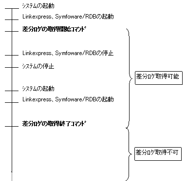 Linkexpress、Symfoware/RDBの停止(Symfoware/RDBの延長で実行されるLinkexpress Replication optionの停止を含みます)、またはシステムの停止で、差分ログの取得可能状態が解除されることはありません。